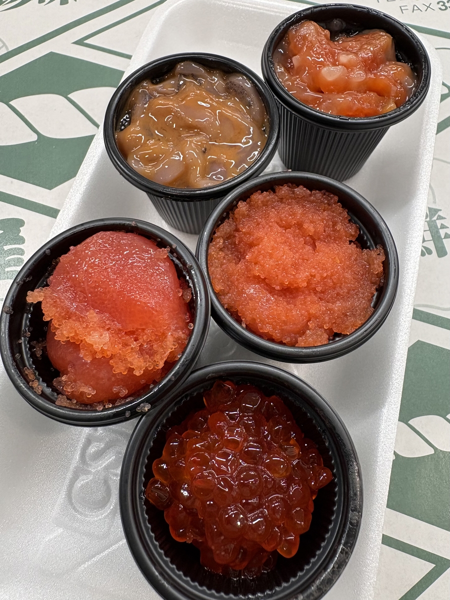 - 魚卵ミニカップセット (デンマーク産すじこ ロシア又はアメリカ産加工たらこ、辛子明太子 国内産いか塩辛 アメリカ産加工紅鮭切り込みのミニカップセット 5カップ合計110グラム)